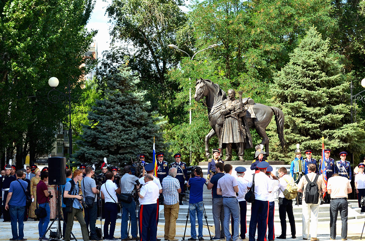 Теперь в донской столице стоит точная копия монумента, установленного герою Отечественной войны 1812 года два года назад в Москве. Выступая на торжественной церемонии, временно исполняющий обязанности губернатора Ростовской области Василий Голубев поблагодарил его создателей – нашего земляка, скульптора, члена Московского Союза художников Константина Чернявского и архитектора, заслуженного художника России Александра Шапина – за яркое воплощение в бронзе образа истинного патриота России генерала Платова.