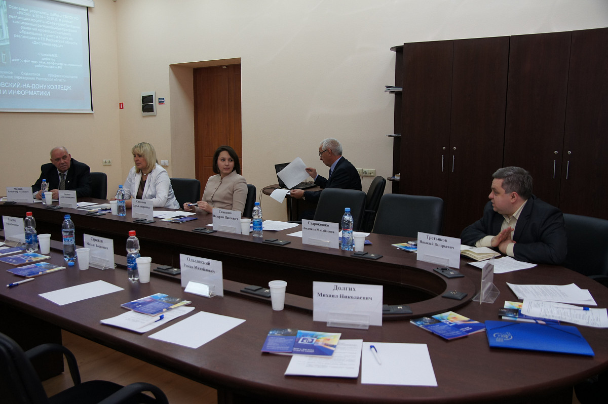 Открыла заседание Анна Александровна Паршина, заместитель министра общего и профессионального образования Ростовской области, докладом «О мерах, принимаемых Правительством Ростовской области по реализации государственной политики сфере подготовки рабочих кадров и специалистов в системе профессионального образования Ростовской области». Далее с докладом выступил директор нашего колледжа. Михаил Борисович Стрюков рассказал об основных результатах работы колледжа в 2014-2015 годах в рамках реализации проекта «Совершенствование комплексных региональных программ развития профессионального образования с учетом опыта их реализации и ГП Ростовской области «Доступная среда» и о планах на 2016 год. В ходе заседания для членов Общественного совета была проведена экскурсия по колледжу.
