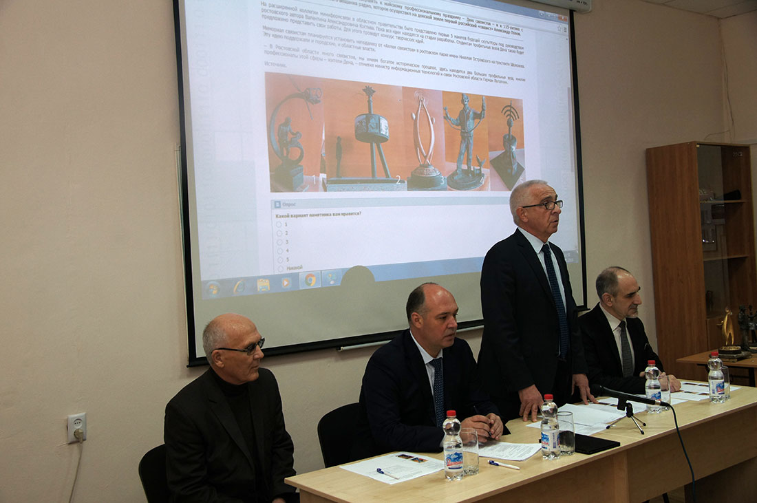 На встрече были подведены итоги интернет-опроса, проведенного среди студентов и сотрудников колледжа, по выбору макета будущего памятника работникам отрасли связи в Ростове-на-Дону.