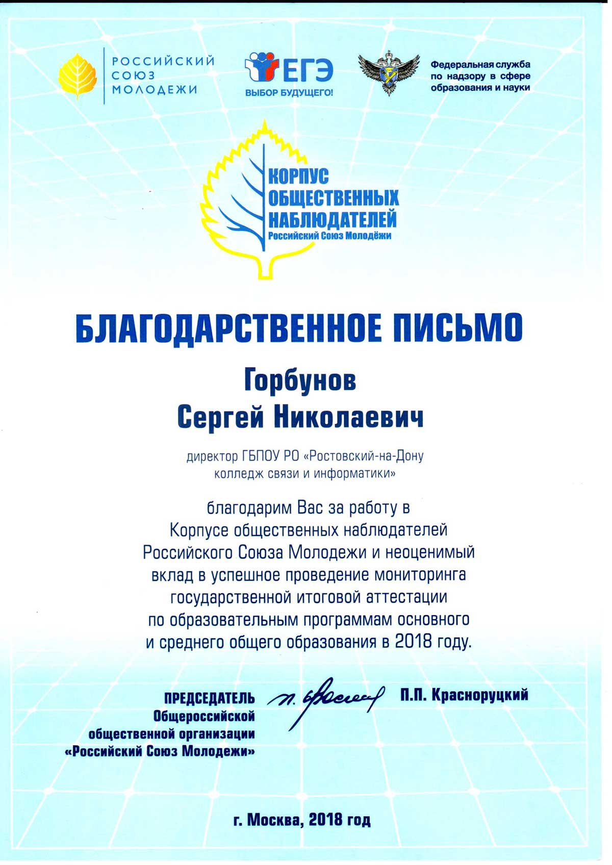 Директор нашего колледжа Сергей Николаевич Горбунов отмечен благодарственным письмом Корпуса общественных наблюдателей Российского союза молодёжи за вклад в проведение мониторинга ГИА.