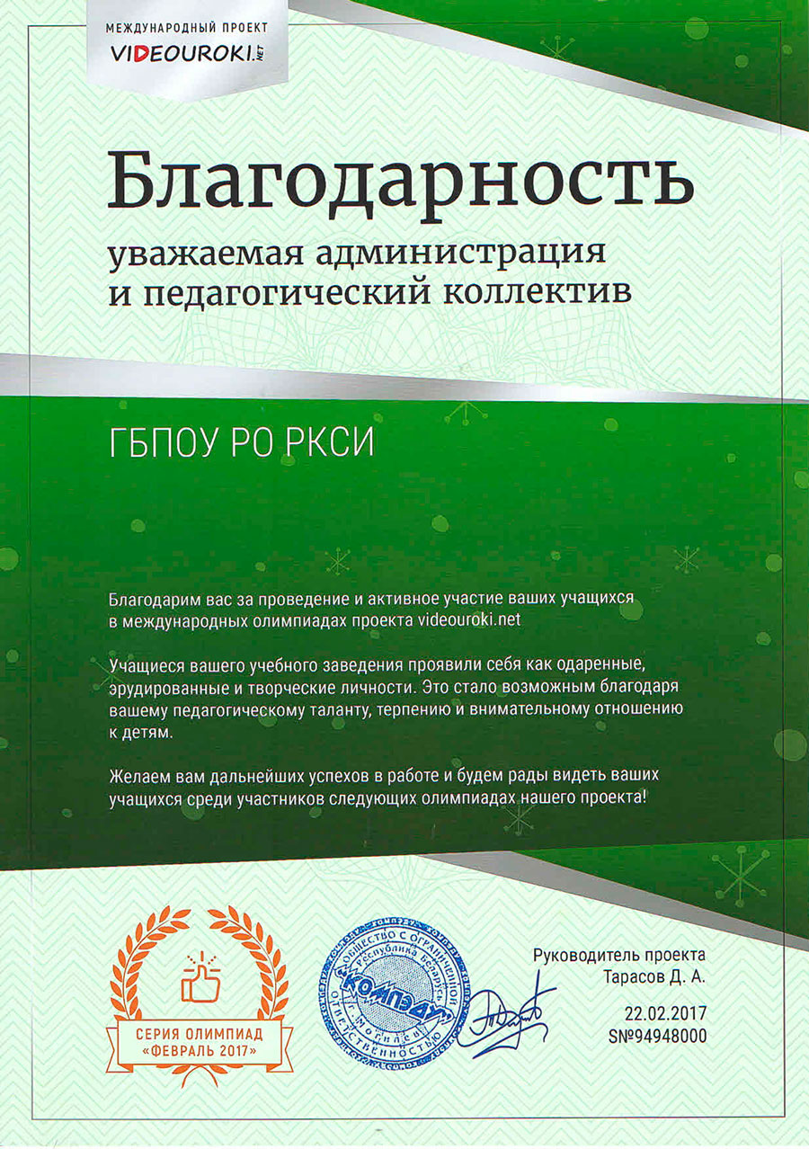 Педагогический коллектив и администрация нашего колледжа отмечены благодарственным письмом за проведение и активное участие студентов РКСИ в международных олимпиадах «Videоuroki.nеt».