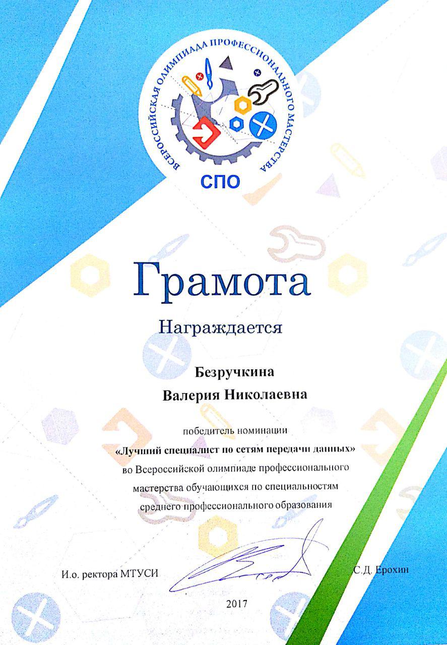 Поздравляем Валерию Безручкину с победой во Всероссийской олимпиаде профессионального мастерства (г. Москва) в номинации «Лучший специалист по сетям передачи данных».