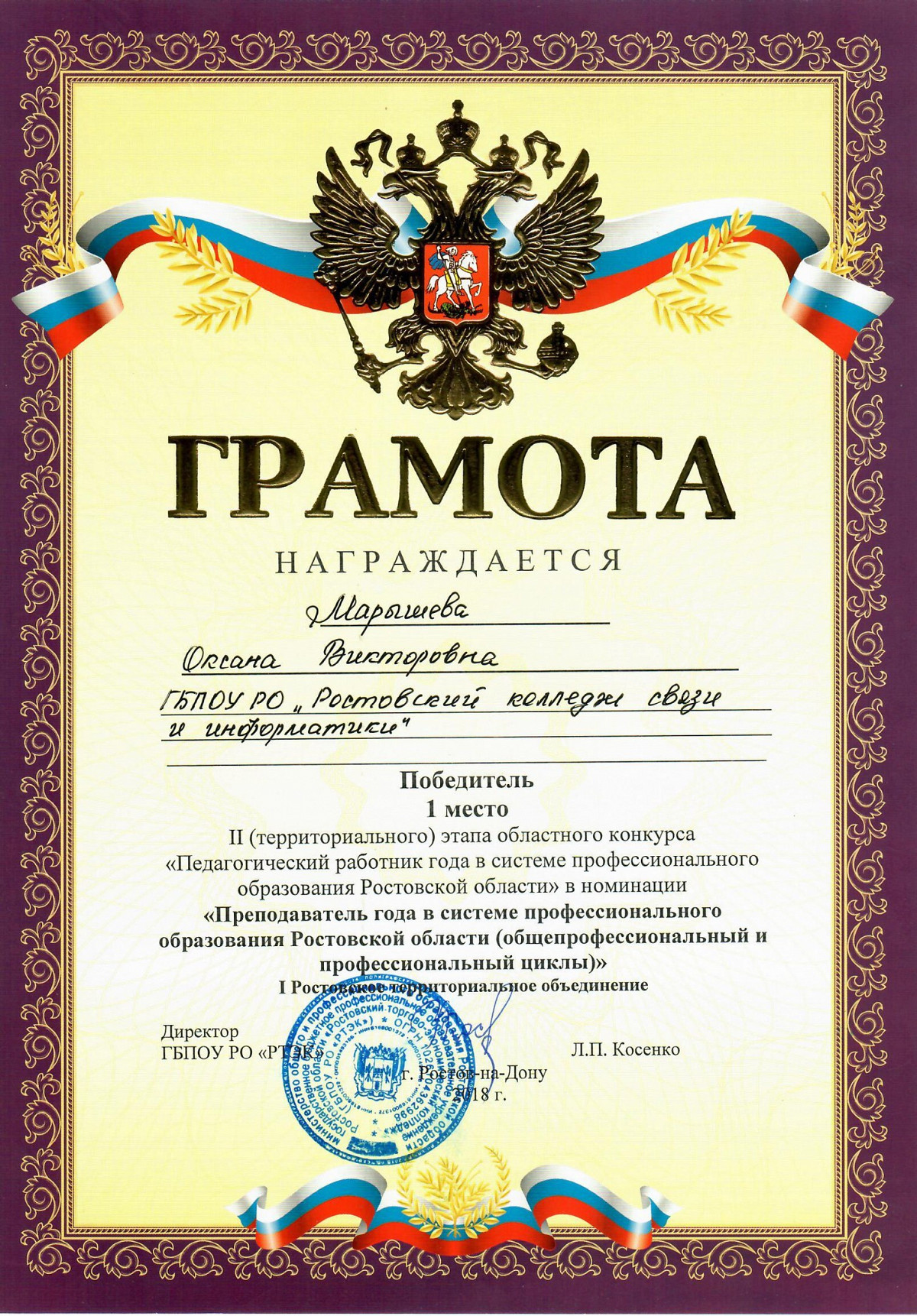 Оксана Викторовна заняла I место в номинации «Преподаватель года в системе профессионального образования Ростовской области (общепрофессиональный и профессиональный циклы)», I Ростовское территориальное объединение.
