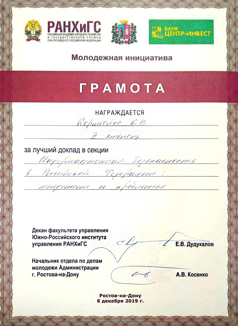 Студент РКСИ Кирилл Корниенко награждён грамотой научно-практической конференции «Молодежная инициатива-2019» с международным участием за доклад «Информационная безопасность в Российской Федерации: тенденции и проблемы».
