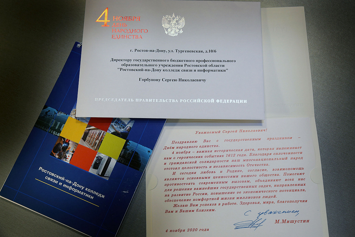 В адрес нашего колледжа поступило поздравление с Днём народного единства от Председателя Правительства Российской Федерации Михаила Владимировича Мишустина.